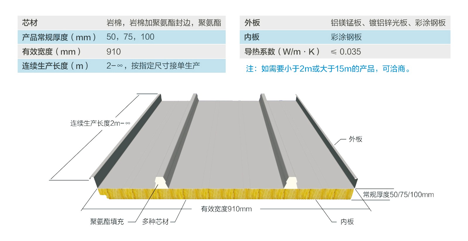 昱板,其屋面独特的波峰设计可直接和卡扣件连接,无需打穿屋面结构,100%防漏;屋面板通过360度直立锁口形式安装,可达到一级防水效果。屋面板采用高品质彩涂钢板做面板,经连续冷弯成型后,通过专用聚氨酯岩棉胶和岩棉芯材进行在线复合而成,产品采用连续生产线工厂化标准生产,产品品质稳定。