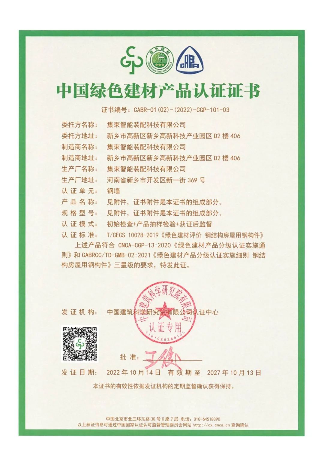 近日,集术装配房屋钢结构系列产品实力荣获“中国绿色建材产品认证”三星级认证,该级别为“中国绿色建材产品认证”分级认证中的最高等级。