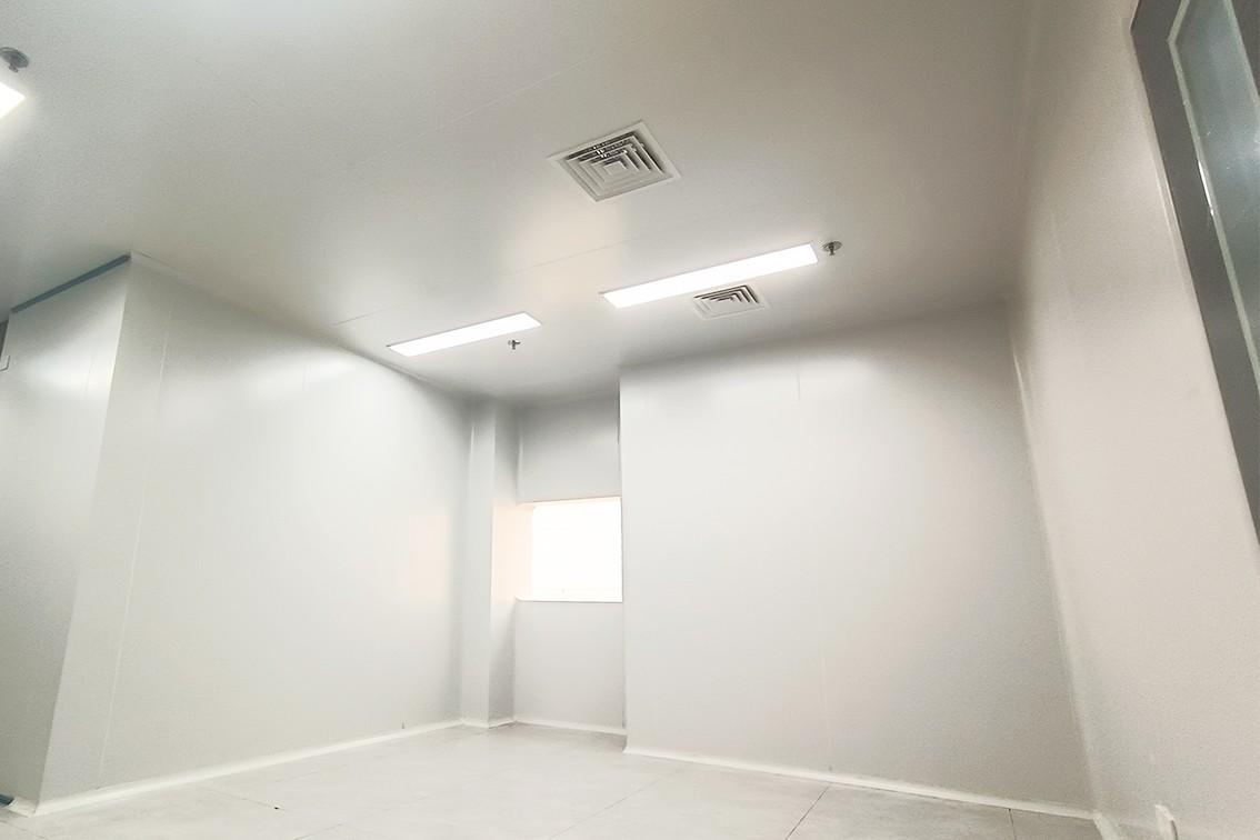 以平为净,诠释净美底色。净化板面板为纯平板面,平整度高、光洁美观,不易沾灰。洁净室墙壁、吊顶、照明、门窗及风口处的致密无孔细节密封设计,严防灰尘与水汽进入。