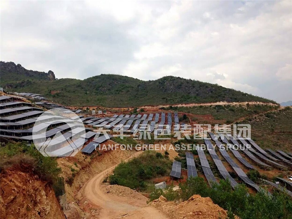 在山地光伏组件支架设计选型和安装上,山区通常采用固定式。光伏方阵采用固定式布置时,最佳倾角应结合当地的多年月平均辐照度、直射分量辐照度、散射分量辐照度、风速、雨水、积雪等气候条件和技术经济比对进行设计。