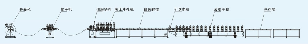 TF光伏支架C型钢冷弯生产线由开卷机、校平机、伺服送料机、冲孔机、输送导道、成型主机、托料架组成。