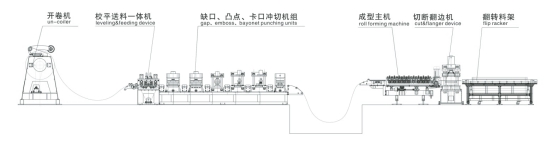通过切换可生产50多种规格型号门板,更换板型快捷方便,一人即可操作整线。PLC集中控制整线的开卷、校平送料、定长冲孔、冲缺口、压凸点、剪切翻边、辊压成型、自动卸料,可一次设定多组制件数据任务,自动化生产,可遥控控制。