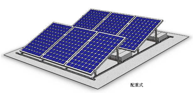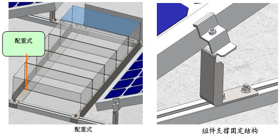 配重式安装系统,无需破坏原有防水层,适用于户外或平面屋顶荷载量较大的情况。底部框架使用优质铝导轨,固定采用水泥块或石块等重物,支撑件材料为不锈钢,牢固美观,独创的铝合金导轨与单元连接设计,无需现场二次加工。